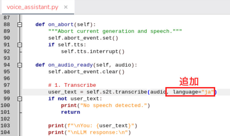 /home/pi/hailo-apps/hailo_apps/python/gen_ai_apps/voice_assistant/voice_assistant.pyを開いて、language=”ja”を追加します。