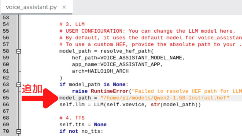 以下の行にmodel_path = “/home/pi/models/Qwen2-1.5B-Instruct.hef”を追加します。