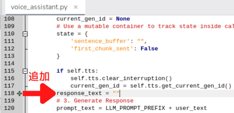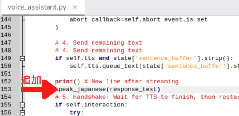 日本語で回答してもらうために、import文の下に以下を追加します。from hailo_apps.python.core.common.defines import LLM_PROMPT_PREFIX, SHARED_VDEVICE_GROUP_ID, HAILO10H_ARCH, VOICE_ASSISTANT_APP, VOICE_ASSISTANT_MODEL_NAMEの行より下に記述します。
