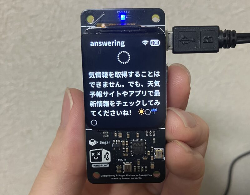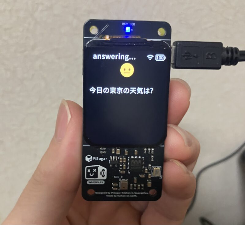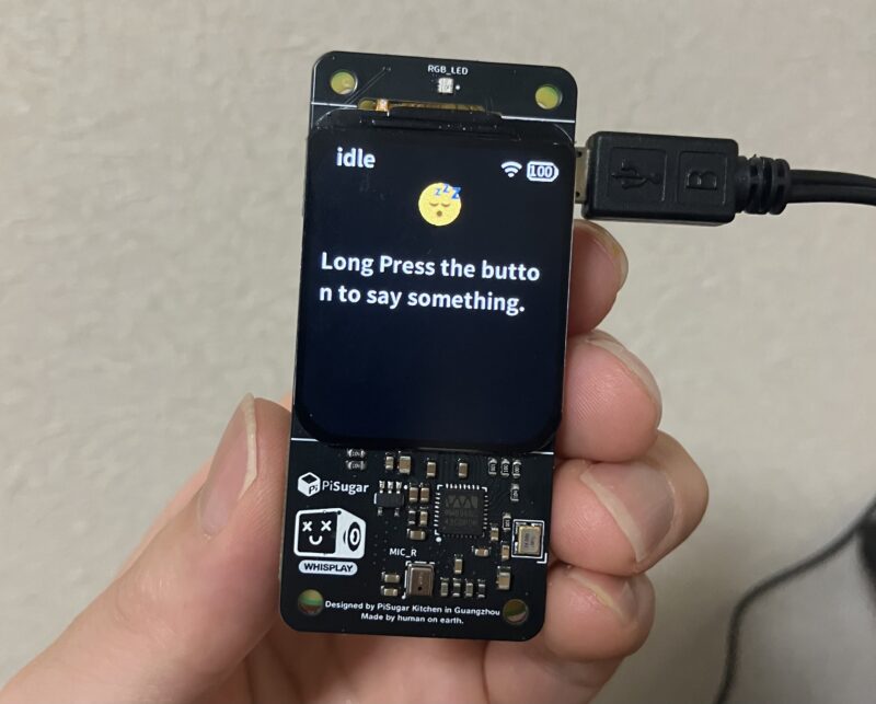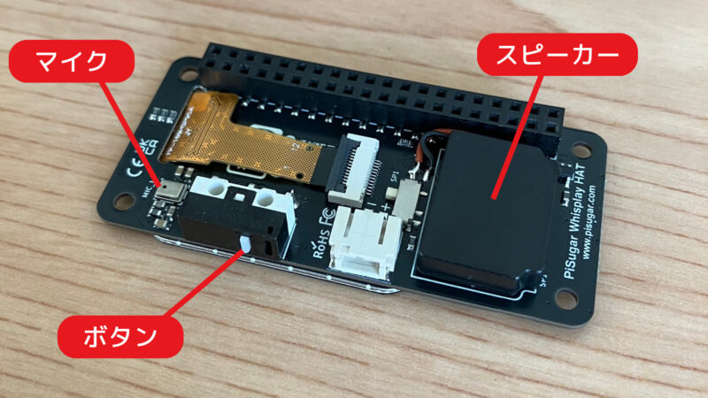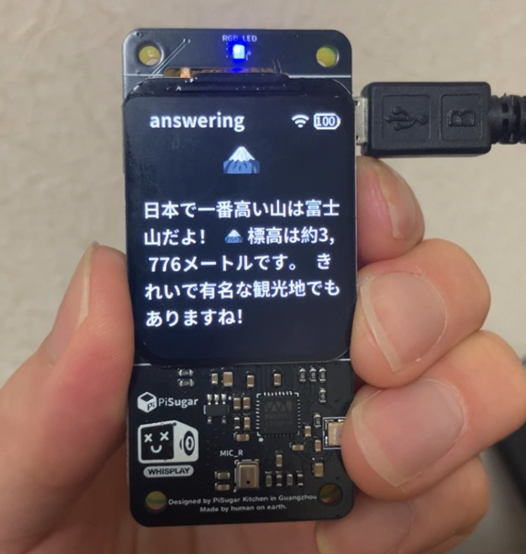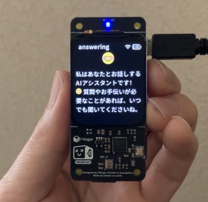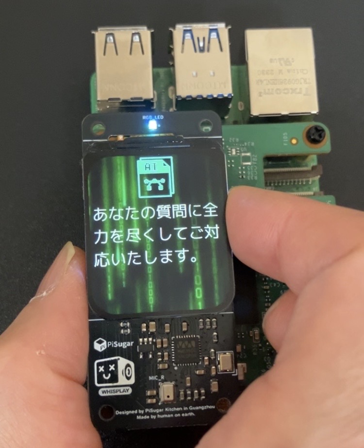 起動後は、Whisplay HATの右側面に付いている白いボタンを押している間に話しかけます。話し終えたらボタンを離すと、音声がOpenAIに送信され、内容が解析されます。