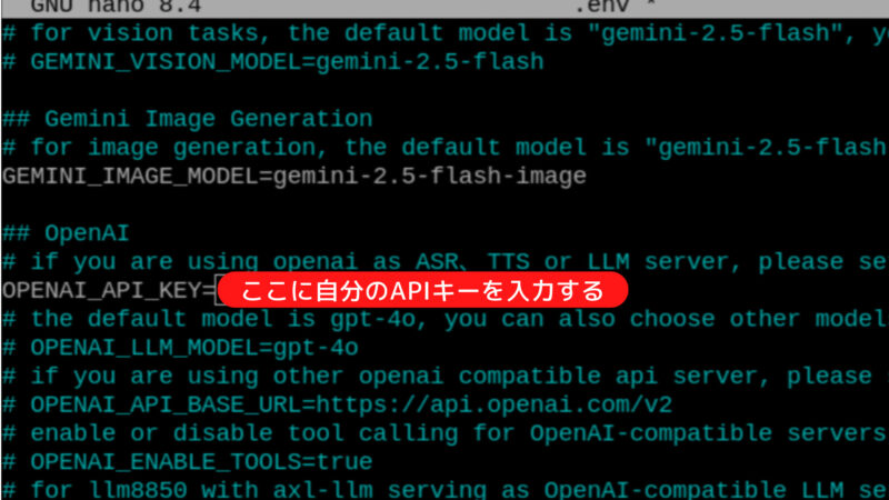 テンプレートはデフォルトで音声認識・会話処理・音声出力のすべてをOpenAIで行う設定になっています。.envの下の方までスクロールして、OpenAIのAPIキーを入力します。