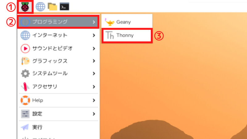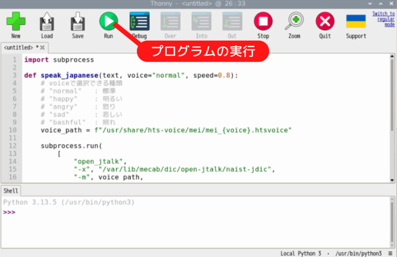 Thonnyを開いて、Pythonのプログラムを実行します。