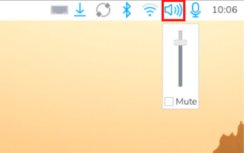 スピーカーの音量は、デスクトップ画面右上のスピーカーのアイコンをクリックして変更できます。